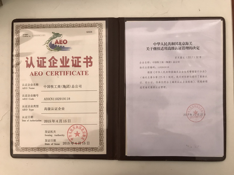 中牧集团此次顺利通过海关AEO高级认证企业重新认证,是在公司主要领导高度重视,办公室、国际部联合牵头组织,各相关业务部门和职能部门大力协助下共同努力取得的,这对于公司加强管理制度建设和完善企业信用体系,提升规范管理水平,提高进出口贸易效率,加快贸易转型升级等方面都有着非常重要的意义。