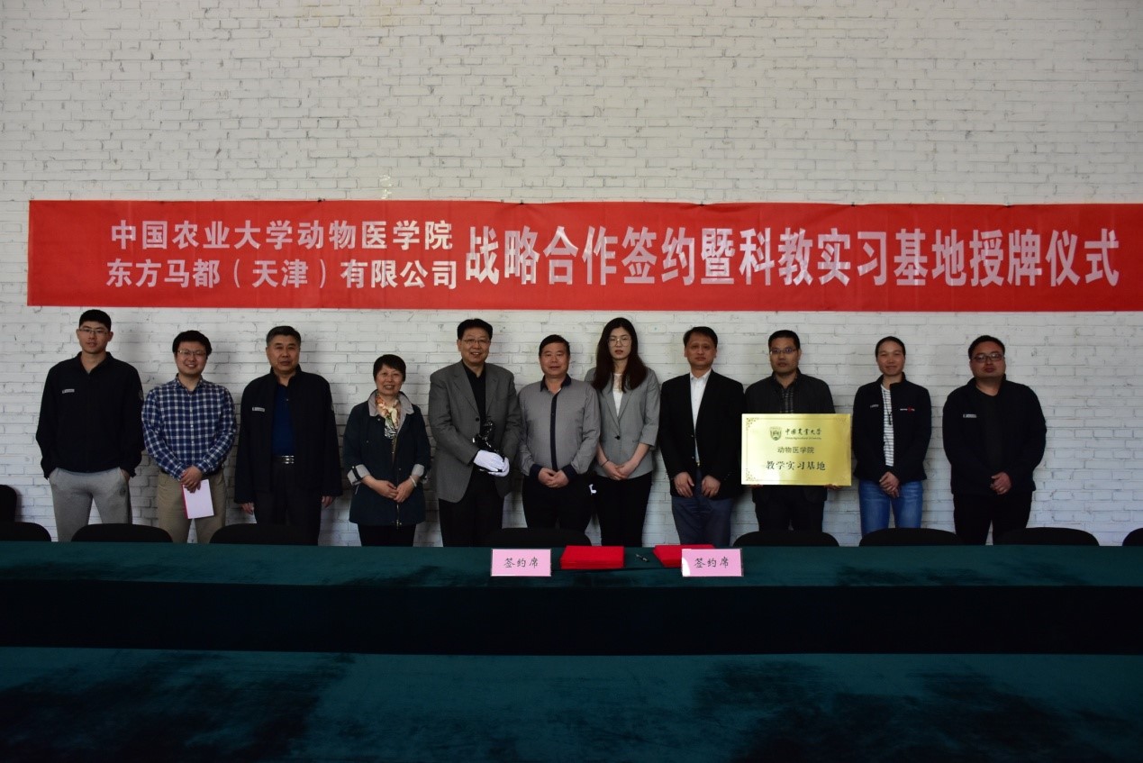 2018年4月12日,东方马都(天津)有限公司与中国农业大学动物医学院战略合作签约暨科教实习基地授牌仪式在东方马都隆重举行。中牧集团总经理兼东方马都董事长薛廷伍先生,中国农大动物医学院副院长林德贵教授一行参加了签约授牌活动。