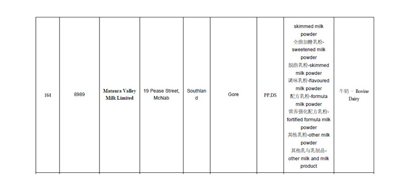 2018年12月26日,海关总署在官网上刊发《部分境外输华乳品生产企业注册信息更新》,更新了新西兰(乳制品(婴幼儿配方乳品除外)生产企业在华注册名单,中国牧工商集团有限公司控股的新西兰马陶拉乳业有限公司(Mataura Valley Milk Limited)(注册号为:8989)通过乳品境外生产企业注册。