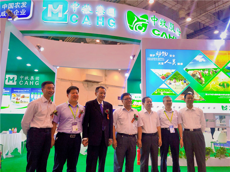 原农业农村部总畜牧师王智才、全国畜牧总站站长王宗礼、青岛市政府副秘书长万建忠、山东省畜牧兽医局局长唐建俊和中国畜牧业协会秘书长何新天等领导在杨总陪同下参观了中牧集团展位,给予中牧集团、中牧股份高度赞扬,并在展位前合影留念。